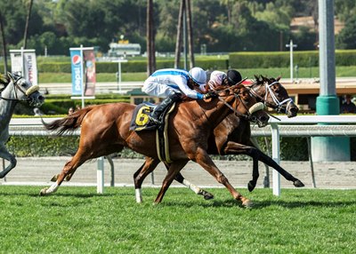 "It was really close, it could probably go both ways, 50-50, inside or outside, and thanks to my filly, we got it," said Hernandez, who chalked up his third win on the day. "It was better, because last time (a fourth-place finish in the March 27 Santa Ana Stakes, (G3T)) I think we were a little too close to the pace and today, I was a little bit more (relaxed). Two horses in front of me and she relaxed pretty well. Around the quarter pole, when I asked her to go, she responded really well."