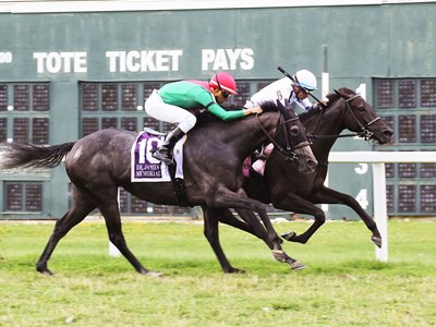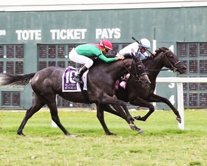 After rating fourth behind fractions of :23.22, :47.67, and 1:11.63 set by longshot Glamorous Thunder , the 4-year-old daughter of Karakontie rapidly split rivals under Joe Bravo in the 1 1/16-mile turf event for fillies and mares 3-year-olds and up, and edged a determined foe in Madita after a long drive to secure the victory by a neck.
