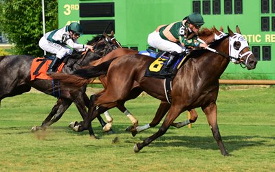 Coming off a win in the July 4 Ellis Park Turf Stakes, She'sonthewarpath chalked up her second stakes win of the RUNHAPPY Meet at Ellis Park with a half-length victory over 8-5 favorite Dominga in the $99,875 Kentucky Downs TVG Preview Ladies Mile. Dominga was second beaten a neck in the Ellis Park Turf.