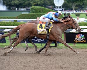 He won on both the dirt and turf, with his biggest victory coming in the 2014 Travers Stakes (G1) at Saratoga Race Course where he defeated Wicked Strong , Tonalist , and Bayern . The Travers topped a four-race win streak for V. E. Day, who earlier that summer at the Spa took the Curlin Stakes. His stakes victories followed an off-the-turf maiden win in the slop at Belmont Park and an allowance score on the inner turf there. The next year at age 4, V. E. Day was second in the Brooklyn Invitational Stakes (G2) and Temperence Hill Invitational Stakes, both on the Belmont Park main track. He raced from ages 3-5, collecting a 4-3-3 record in 17 starts.