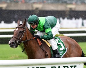Neither wind nor rain nor a soaked turf course could stop Virginia Joy from delivering as an odds-on favorite as the Soldier Hollow mare splashed to a lopsided, geared down 14 1/4-length victory in the $186,000 Sheepshead Bay Stakes (G2T) May 7 at Belmont Park.