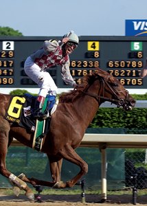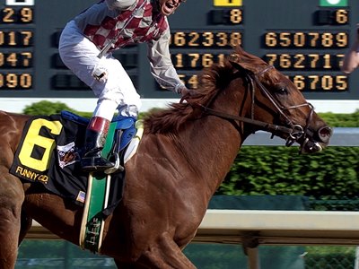 Funny Cide won the 2003 Kentucky Derby (G1) and Preakness Stakes (G1) before losing the Belmont Stakes (G1) and his Triple Crown bid. Trained by Barclay Tagg, Funny Cide, a son of Distorted Humor , was named New York-bred divisional champion three straight years and the New York-bred Horse of the Year in 2003. He was foaled at McMahon of Saratoga Thoroughbreds.