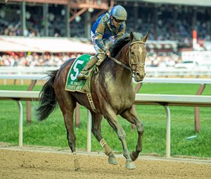 Under jockey Junior Alvarado, Cody's Wish settled far off a spirited early pace of :22.75 and :45.10 established by 1-9 favorite Jackie's Warrior with Pipeline in hot pursuit. Jackie's Warrior shook off Pipeline in midstretch but Cody's Wish, who had begun building up momentum around the final bend, stormed down the center of the stretch to catch Jackie's Warrior in the final sixteenth.