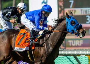 That gut feeling proved reliable Oct. 1 when Whatmakessammyrun and jockey Joe Bravo launched a gutsy move between horses on the dirt crossover to seize the lead and then hold off all stretch challengers for a three-quarter-length victory in the $200,000 Eddie D Stakes—the first graded stakes score for the 4-year-old We Miss Artie gelding.