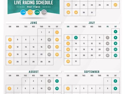 Post times are similar to recent seasons, with Saturday post 2 p.m. May 13-June 24 and 5 p.m. July 1-Sept. 16. Sunday post is 2 p.m. throughout the meeting, while Friday post (beginning June 9) is 7 p.m. Holiday racing is scheduled May 29 at 2 p.m. and July 3 at 5 p.m.