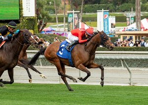 Dicey Mo Chara started his career with a single start in Ireland, finishing second. Shipped to California, he took three more tries to find the winner's circle at Del Mar in July of 2021. Since then, Powell has had him competing primarily in graded stakes but the San Gabriel was his first win at the top level and fourth from 17 starts. The $120,000 winner's share of the $200,000 purse increased his bankroll to just more than $430,000.
