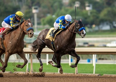 Setting out in front quickly under the Southern California track's leading jockey, Juan Hernandez, the gray or roan son of Good Magic battled through fractions of :22.28 and :45.57, with Spun Intended dueling early in an attempt to put a nose in front. Spun Intended dropped back after briefly leading at the half-mile mark. He was pulled up and walked into a van following the race.