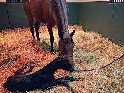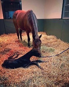 Darley America's second-year stallion Maxfield , winner of the Breeders' Futurity (G1) and Clark Stakes (G1), was represented by his first reported foal Jan. 7 at Kiki Courtelis' Town and Country Farms in Georgetown, Ky.