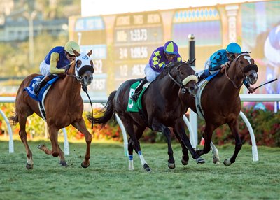 Du Jour , second in the Thunder Road Stakes, was away from the races for all of 2022 after competing with some success in the big-money New York turf races in 2021. The rare turf horse in the Bob Baffert barn showed no signs of rust while finishing second in the Thunder Road in his comeback from the 13-month layoff.