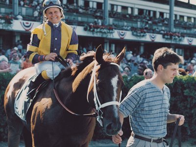 Julie Krone — In 1993, she became the first woman to win a Triple Crown race when riding Colonial Affair to victory in the Belmont Stakes (G1), and in 2003 Krone became the first woman to win a Breeders' Cup race when she rode Halfbridled to victory in the Breeders' Cup Juvenile Fillies (G1) at Santa Anita Park. The all-time leader among female riders by victories (3,704) and purse earnings ($90.1 million), Krone was the first woman inducted into the Racing Hall of Fame in 2000.