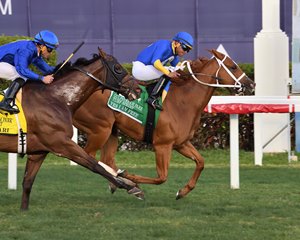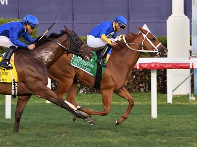 Carotari, who won the 2020 and 2021 Silks Run, made a steady bid while racing between horses throughout the stretch but was unable to catch the front-running defending champion of the Gulfstream Park Turf Sprint.