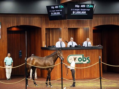The colt, consigned as Hip 489, is out of the grade 3-winning Bellamy Road mare Georgie's Angel , and full sibling to the Del Mar Futurity (G1), American Pharoah Stakes (G1) winner, and Breeders' Cup Juvenile (G1) second Cave Rock.
