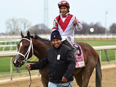 PV: The mare Lady Esme was named for my wife's aunt, who lived in England and passed away a few years ago at 95. We decided to name a horse after her because she loved horses and racing. In her last few years, that is what she loved, watching horse racing all the time. Lady Esme is a really big, good-looking horse, so we decided to give it a go. We went with Curlin and got lucky; the mare has been doing well. We named him Lord Miles because my wife's aunt was married to a man named Miles, and we think it's a great name.