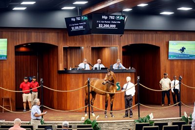 About midway through the third of four sessions of the Ocala Breeders' Sales Spring 2-Year-Olds in Training Sale, a new juvenile moved to the top of the results table when Donato Lanni, agent for Zedan Racing Stables went to $2.2 million to land a son of record-breaking sire Gun Runner .