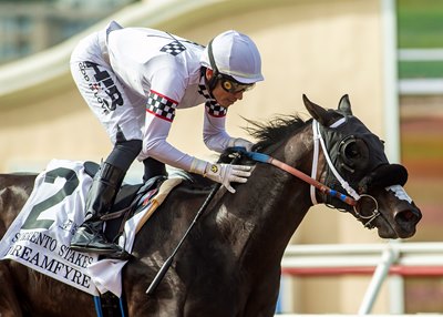 A daughter of Flameaway , a stakes winner on the turf himself, it appears the mile distance of the Zuma Beach will present the biggest obstacle to Dreamfyre as opposed to the surface change. Trained by Golden Gate-based trainer O.J. Juaregui, Dreamfyre captured her first two starts in dazzling gate-to-wire performances. In her last trip to post, she kicked clear by 3 1/2 lengths in the Aug. 12 Sorrento Stakes (G3) at Del Mar after setting demanding early fractions.