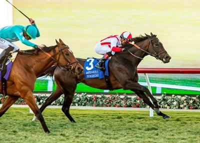Surge Capacity at 3 is the youngest and least experienced of Brown's 2023 Matriarch runners, but she certainly has heart. She came through the narrowest of openings on the rail for jockey Joel Rosario in a move reminiscent of her victory in the Oct. 27 Valley View Stakes (G3T) at Keeneland to edge stablemate Fluffy Socks , who had mounted her own big run from the outside. Beaute Cachee finished third followed by Whitebeam in fourth.