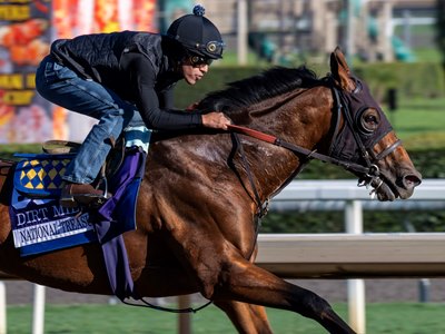 A hard-knocking millionaire and winner of last year's Charles Town Classic (G2), Daniel Alonso's Skippylongstocking last surfaced in the Dirt Mile, finishing 3 3/4 lengths behind National Treasure in third.