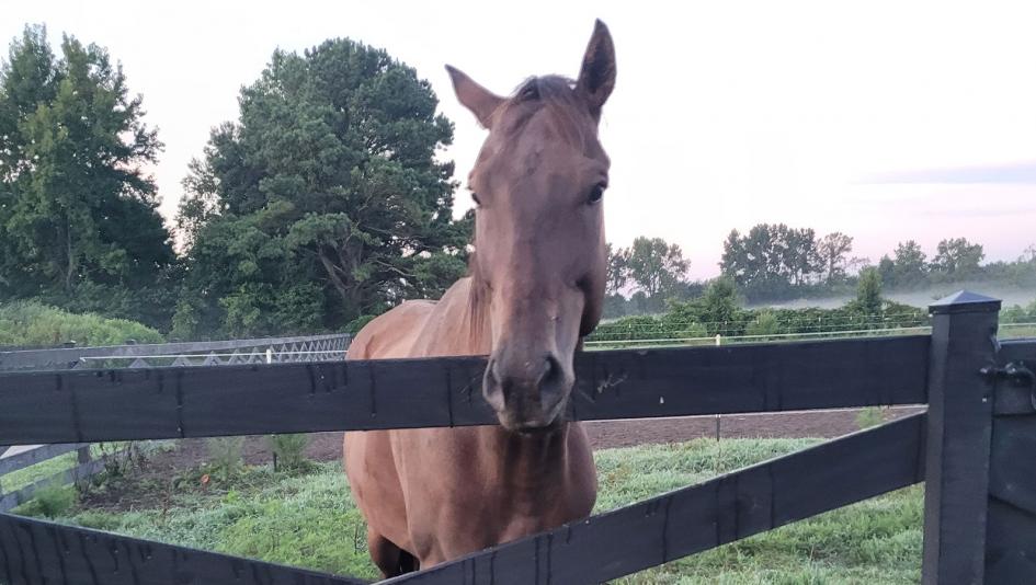 Heather Mathias was drawn to Circle A Home for Horses in Virginia Beach, Va., by her passion for her horses as she sought an interview for a position on the farm. On the day of her interview, she encountered a delightful surprise. Inside one of the stalls stood a bay gelding named Here Comes Sharyn. As she approached his stall, he greeted her warmly by gently pressing his forehead against hers.