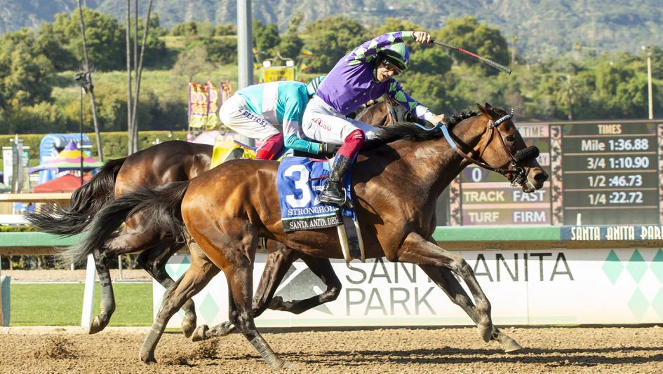 Stronghold won a stretch duel against favored Imagination and emerged victorious in the $750,000 Grade 1 Santa Anita Derby April 6 at Santa Anita Park.