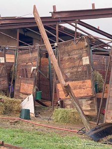 The barn area took a major hit as multiple barns had their roofs torn off, trailers were overturned, and debris covered the ground.