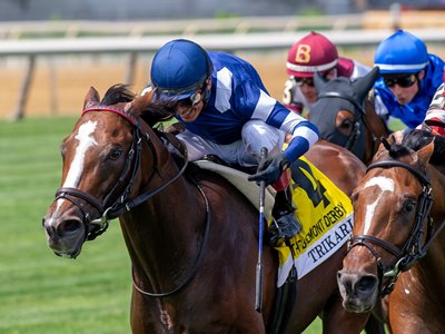 Since breaking his maiden on the eve of his 3-year-old campaign in December at Gulfstream Park, Trikari has been nearly undefeated in 2024. Owned by John and Jerry Amerman, who campaigned Trikari's multiple grade 1-winning sire Oscar Performance, Trikari netted black-type victories in the Rushaway Stakes and American Turf Stakes (G2T) before his hard-fought win over White Palomino in the Belmont Derby.