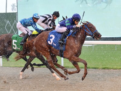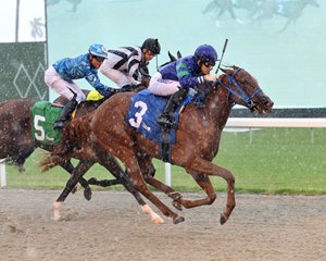 Trailing until nearing the stretch, 2-year-old filly Del Rosario kicked into gear leaving the second turn. She advanced into fourth by midstretch and surged into the lead late before registering a victory by three-quarters of a length amid a driving rainstorm. She was timed in 1:44.74 for the distance under apprentice Melvis Gonzalez, paying $6 to win against maiden $35,000 claimers.