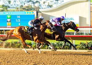 Going into the turn, The Chosen Vron pulled up alongside of Raging Torrent, thrusting his nose in front. That should have ended the race right there. But Raging Torrent wasn't even close to finished. He fought back valiantly, wresting the lead away from the 6-year-old star with a sixteenth to go. The pair raced head and head to the wire, with Raging Torrent edging The Chosen Vron by a neck and stopping the clock in 1:21.17.