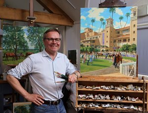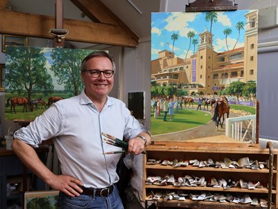 "I went last August to study the characteristics of the track," Church said of visiting Del Mar for the first time to capture the uniqueness of the seaside oval. "It's quite different from tracks in the U.K. I have visited many of the big U.S. tracks, but Del Mar has been top of my wish list. I was eager to include the iconic yellow towers overlooking the paddock. Experiencing the atmosphere there was vital in helping me to capture all that encompasses the quintessential charm of Del Mar."
