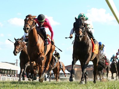 Safeen (inside) defeats She's Lookin Lucky by a head to win the One Dreamer Stakes at Kentucky Downs