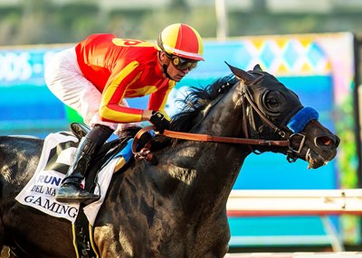 Once Gaming got into a good rhythm, Prat allowed him to sneak up the rail, and they were soon running in second behind Getaway Car. That position put Gaming in a good spot to come around Getaway Car at the five-sixteenths pole. Gaming took the lead turning for home, drew clear in upper stretch, and flashed under the wire 1 3/4 lengths on top in 1:23.02. Gaming then galloped out strongly.