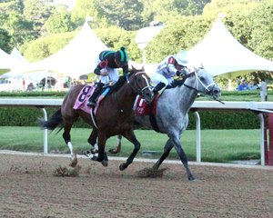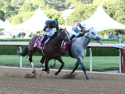 The 1 1/2-length advantage Saudi Crown held midway around the turn began to shrink entering the stretch as Mystik Dan, ridden for the first time by season-leading jockey Francisco Arrieta, began to apply pressure from the outside. The pair drew away from the rest of the field and challenged each other through the stretch run, with Saudi Crown prevailing by a nose, the same margin by which Mystik Dan won last year's Kentucky Derby.