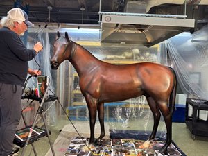 Since opening 40 years ago in 1985, the museum has featured a replica Derby champion in its Winner's Circle exhibit. Louisville artist Mike Prather has been painting and airbrushing the life-sized horse replicas since 1999, capturing every nuance of each Thoroughbred. Work on this latest transformation is already in progress to paint Sovereignty's likeness. This summer, the replica horse will take center stage alongside a replica jockey dressed in the winning team's silks.