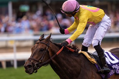 One of those efforts occurred in the 2002 Belmont Stakes (G1). Racing for Edmund Gann, Medaglia d'Oro took command at the quarter pole of the 1 1/2-mile test only to have 70-1 shot Sarava split horses moving into the stretch. The two dueled in upper stretch before Sarava finally prevailed by a half-length at the wire.
