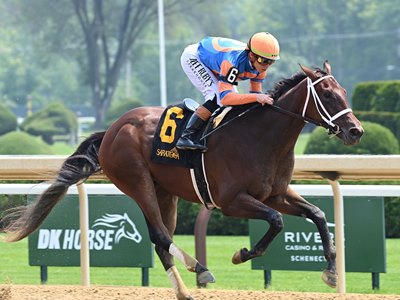 Sent to post as the second choice in a field of seven New York-bred fillies, things got off to a rough start for Angel Gift when she broke in the air leaving the gate, colliding into a rival to her outside. Under the trusty hands of veteran rider Irad Ortiz Jr., the pair regrouped from their shaky beginning by the first-furlong marker but was forced to contend five-wide for the rest of their journey.