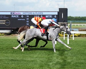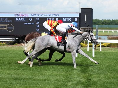 Flying Dutchman Breeding and Racing's homebred Ziggity Zag, trained by Brian Lynch, broke alertly and tracked the pace from second place through much of the 7 1/2-furlong maiden special weight race on the turf. Ridden by Nik Juarez, the gray or roan filly moved to the outside approaching the stretch and gradually overtook pacesetter Dreaming Collect to win by a neck. The final time on the firm turf was 1:29.66.