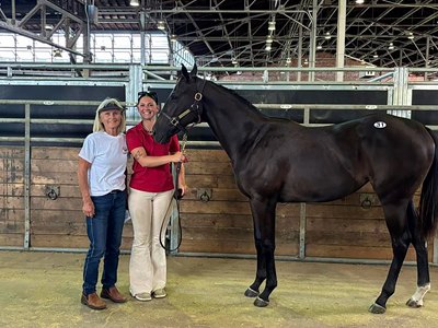 The sales topper (Hip 31)—consigned by Iowa State University, agent for the university and Poindexter Thoroughbreds—is the second foal produced from the unraced Speightstown mare Surpass. Her first foal, a 2-year-old Volatile colt named Outmatch , also bred by H. Allen Poindexter, ran second on debut at Prairie Meadows Aug. 9 for Poindexter Thoroughbreds, AG Racing Stables, Reunion Racing Stables, and Kevin Eikleberry. Eikleberry trains that juvenile.