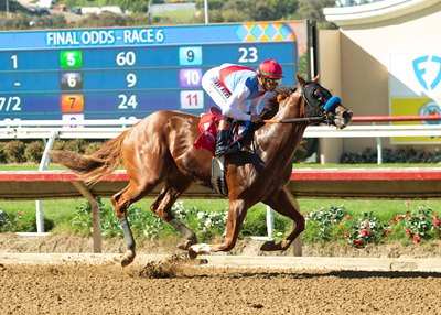 The chestnut sailed under the wire 5 3/4 lengths the best under jockey Tyler Gaffalione, who made the trip out west to ride Sunday's closing day card. Boyd stopped the timer in 1:02.79 for 5 1/2 furlongs on a fast main track, earning a 95 Equibase Speed Figure.