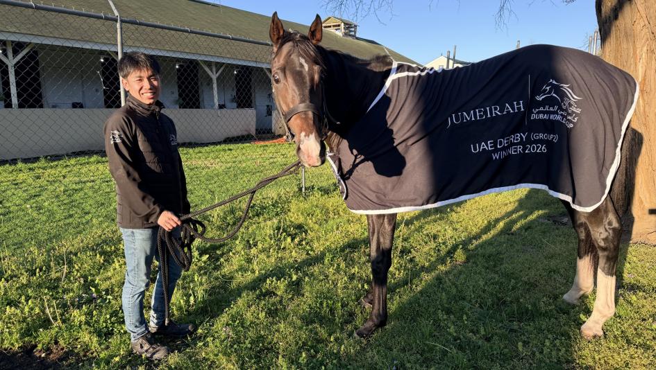 Nimbly mounting United Arab Emirates Derby winner Wonder Dean, Takuya Nakano meets veteran Churchill Downs “pony boy” Mike Crowder and heads out to the track at Churchill for their early morning exercise.