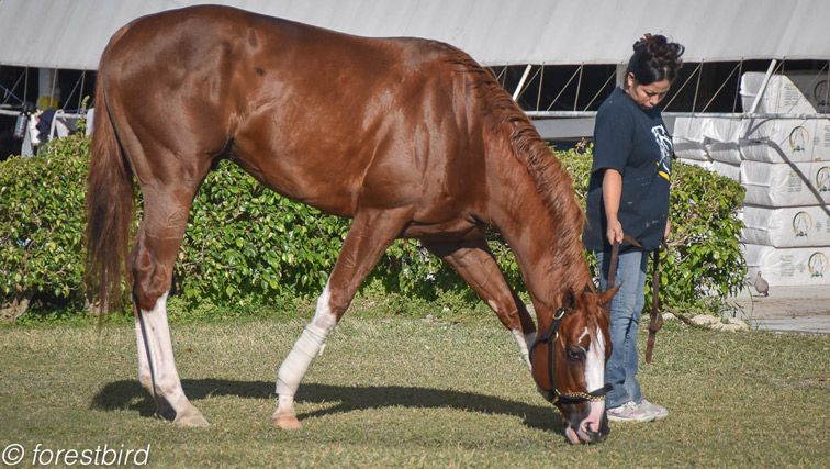 The “babies” are fun to watch, as they start to understand the routines and learn to race or that moment when you see their ears move forward or back, when something falls into place for them. I was especially impressed with one young horse — a bay colt — that walked through his morning routine with calm that is rare for a 2-year-old. He stood still for his bath, and didn’t even lift a foot when his groom wrapped his legs with bandages out of the ice bucket.