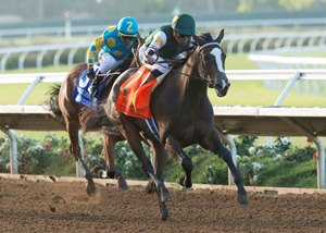Under Martin Garcia, Union Strike got a perfectly patient ride; at one point tracking next-to-last in the field of seven. Morganite took the early lead, after bumping with Miss Southern Miss right after the break, and led the field through fractions of :22.16 and :45.25. Going right with her was American Cleopatra, who passed the fading pacesetter at the top of stretch only to hook up with Champagne Room. Garcia was in the midst of a powerful drive with Union Strike coming out of the turn, and the momentum carried him past the leaders to win by 2 1/4 lengths despite losing his whip. The final time was 1:23.22