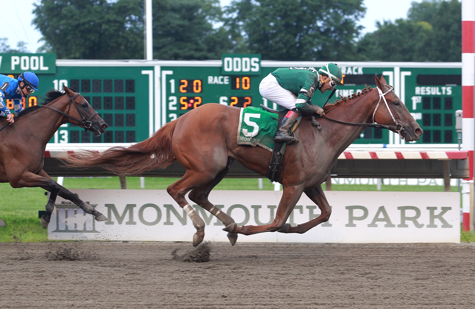 St. Elias Stable’s Teresa Z stormed down the stretch to best longshot Sine Wave by 1 1/2 lengths in the $100,000 Monmouth Oaks (G3) at Monmouth Park Aug. 12.