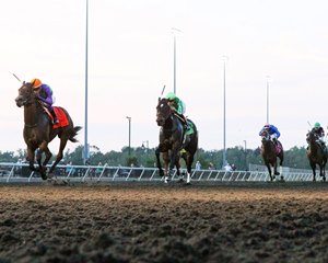 In her stakes debut, Ronald Clark's Cavalia led through the first quarter-mile in :22.52 and half-mile in :45.18. Ami's Mesa raced near mid-pack in the field of 12 early then delivered a splendid run in the turn, steadily gaining ground, while racing four wide.