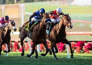Replays didn't show without a doubt whether Excellent Sunset was clear when she came in, but the move caused Fuentes to check Escape Clause. Despite the trouble, the filly fought on and was beaten just a half-length at the wire.