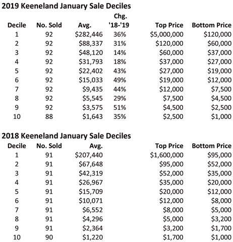 The top two January deciles reported growth in average price exceeding 30%. The highest decile's average increased 36% to $282,446, and the second-highest decile average was up 31% to $88,337. The price ranges for both deciles also shifted upward. The base price in the top decile was $120,000 compared with $95,000 for the base price of the top decile at the 2018 January sale. The base price for the second-highest decile was $60,000 this year compared with $52,000 for the same decile a year ago.