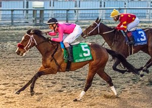 Trained by Jeremiah O'Dwyer, the daughter of Paynter broke well from post 5 in the field of seven sophomore fillies. Racing in the four path around the first turn, she tracked the pace on the outside in third behind early leader Fun Finder, who set opening fractions of :24.12 and :49.57.