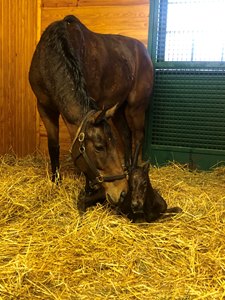 The filly was born at 4:25 p.m. and "jumped right up" according to Toffey. She is the second foal for Beholder, who had an Uncle Mo colt—now named Q B One—last year.