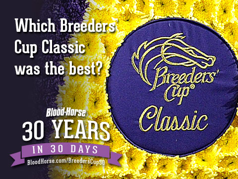 The Blood-Horse editorial staff members were asked to identify their top 10 races in the Breeders' Cup Classic (gr. I) and it was no easy task just deciding by which criteria a race should be judged—toughness of the competition, margin of victory, a monster pari-mutuel? After comparing the results and wrestling enough just with which Tiznow Classic to include (in the end we had to leave them both in), we came up with a list for you to now sort out. Vote for the Classic you believe stands out among the 10 top races shown here and share your comments on The Blood-Horse Facebook page.